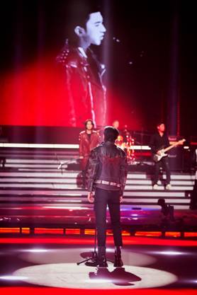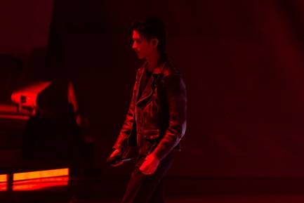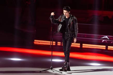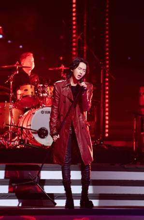 红黑光影之中,蔡徐坤拿着话筒准备就绪,即将摇滚开唱