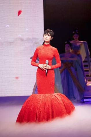 李宇春穿红色形似鲤鱼状修身长裙,在国风舞台之中别有韵味
