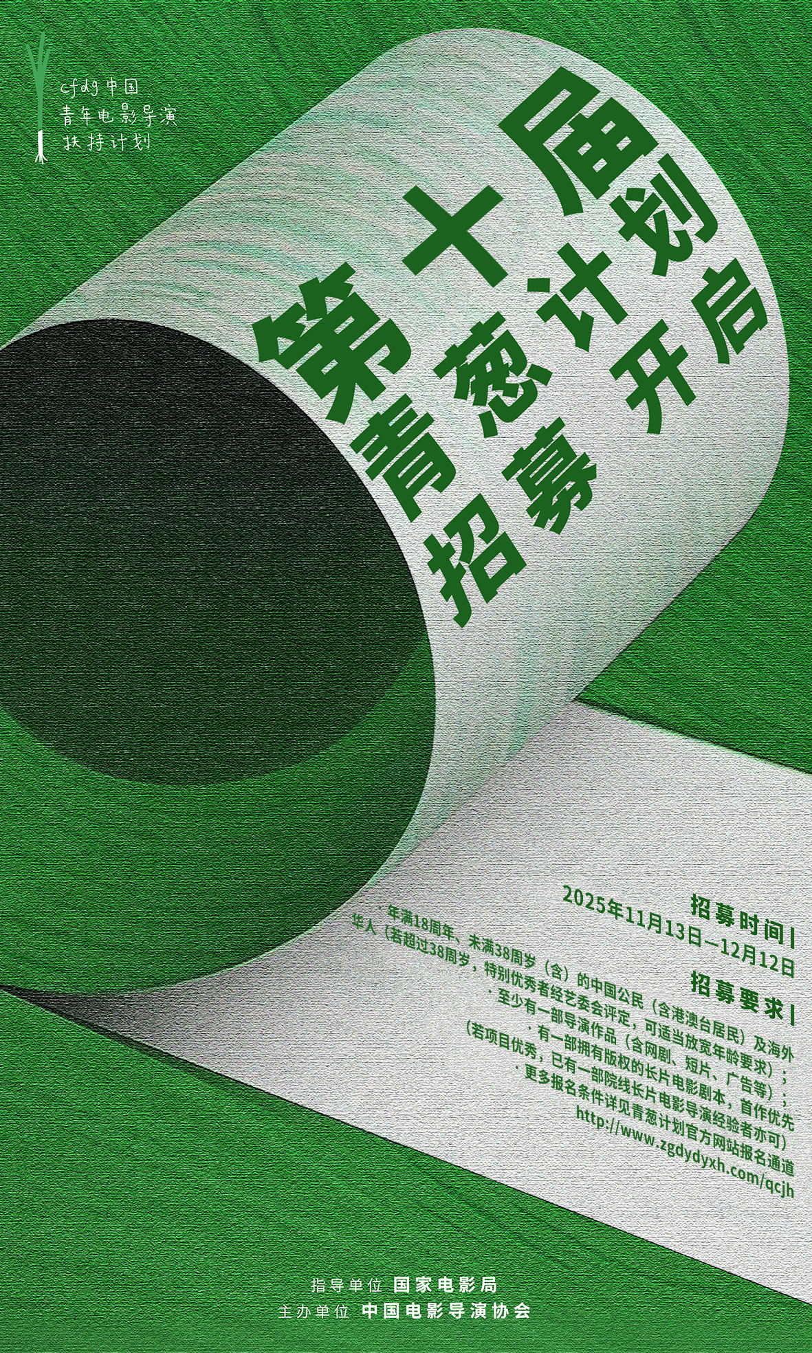 11月13日,中国电影导演协会宣布,第十届青葱计划(中国电影导演协会“中国青年电影导演扶持计划”)正式启动,学员招募通道亦全面开启。即日起至12月12日,符合报名要求的导演可登录青葱计划官方网站报名通道报名。